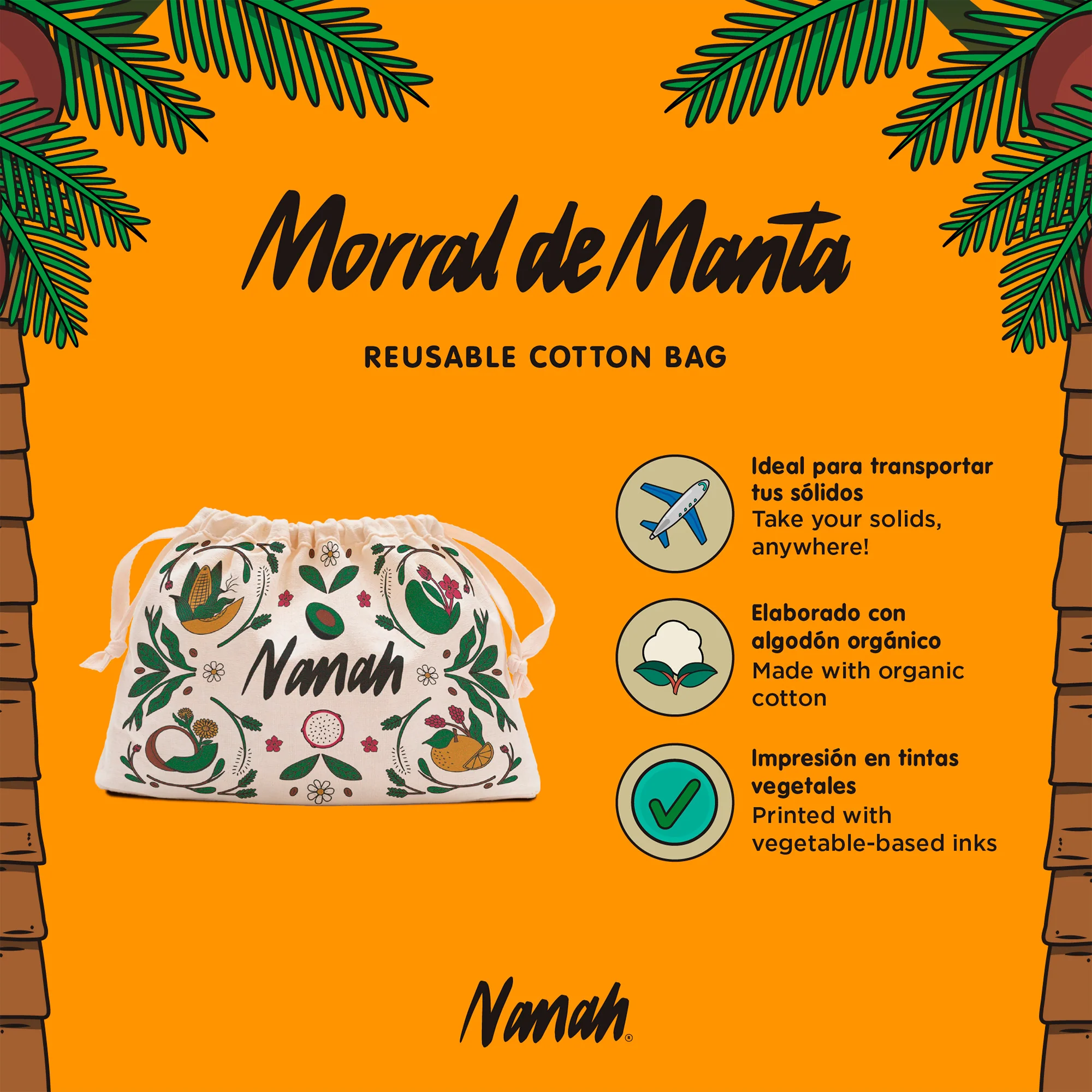 Nuestro morral de manta de algodón orgánico mexicano es ideal para llevar tus sólidos Nanah a donde vayas, de forma práctica y sin generar residuos.