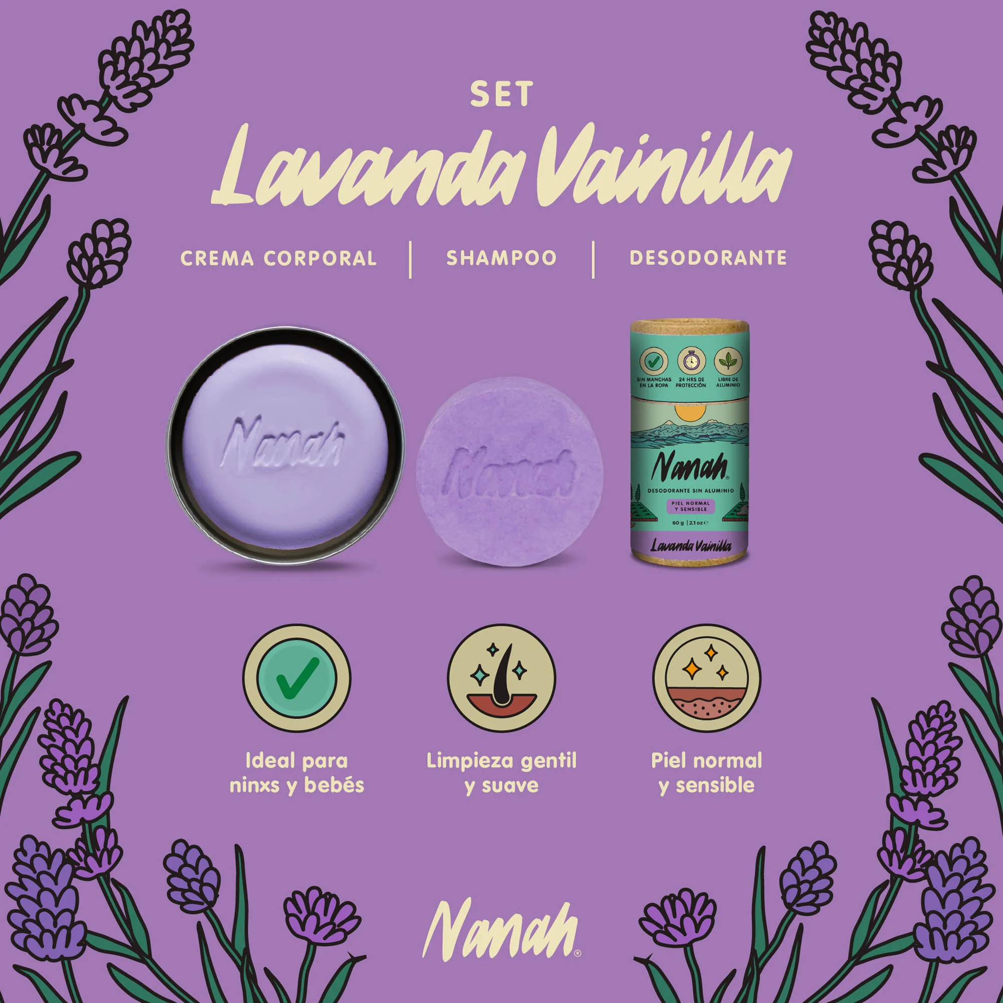 Incluye: Shampoo Lavanda Vainilla + Crema Corporal Lavanda Vainilla + Desodorante Lavanda Vainilla + Morral de Nanah de regalo